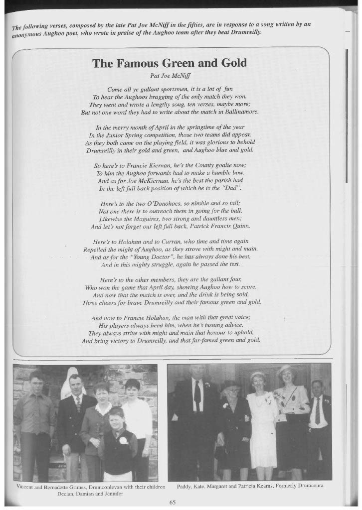 But Drumreilly quickly retaliated – again in the form of verse, when the poet Pat Joe McNiff saw his chance shortly after, when Drumreilly emerged victorious over the Aughoos at a match in Ballinamore,