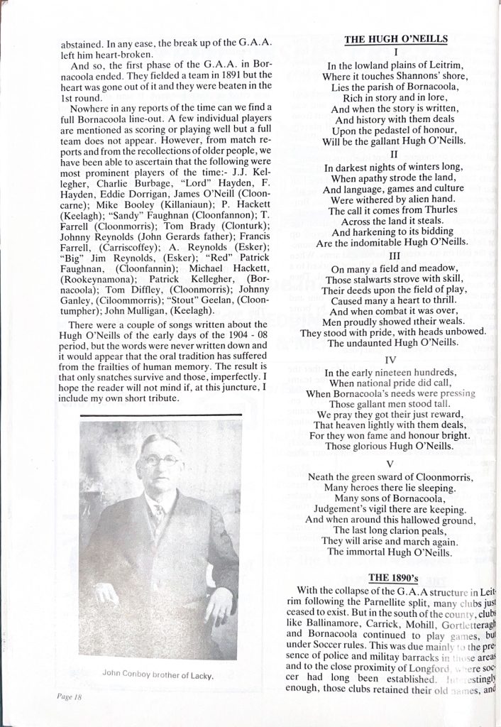 There’s nothing like a sporting victory to incite singing or inspire a song! If you’ve seen footage of the late Galway hurler, Joe McDonagh’s spontaneous rendition of “The West’s Awake” after his team claimed the All-Ireland title in 1980, you will know what I am talking about. The above verses sing the praises of the Bornacoola “Hugh O’ Neills” which was reportedly the first Gaelic football team formed in the county in 1868 and winners of the first ever official Leitrim Senior championship which took place in 1904. Not only does the song immortalise the men who played on the team (a team of 21 played on the field in the early stages!), it also gives us an insight into the history and politics of the game and indeed a broader picture of the cultural landscape of the county.