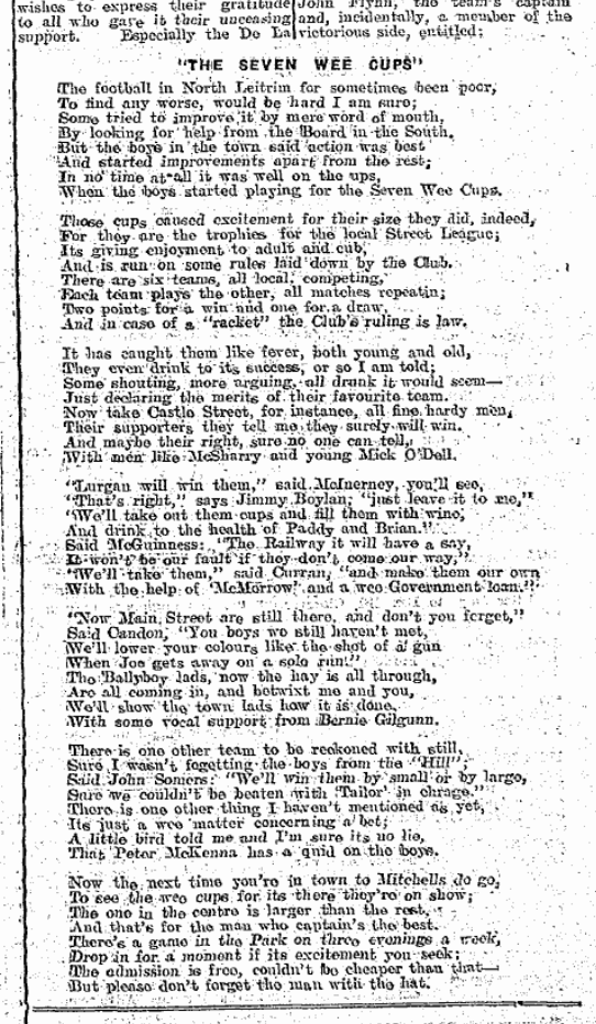 The teams that participated represented Main Street, McDermott Terrace (Boley Hill), the Railway, Castle Street, Lurganboy and Ballyboy and brother could have been pitted against brother. The main objective of the tournament, it seems, was extra training for the Manor boys whose focus was on defeating the Melvin Gaels team at their next meeting. According to the same newspaper report, now that the games were over, the only pastime left for the participants was to render the “Street League Ballad” as written by local postman Sean Flynn, who was a footballer from Cornaneane, Mullies and a member of the winning team.